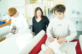 Jungs konnten beim Boy's Day an der HFU in die Welt der Biochemie schnuppern - oder den spannenden Beruf der Hebamme kennenlernen. In den modernen Skills-Labs durften sich die Schüler wie in den Räumlichkeiten einer echten Geburtsklinik fühlen. Zwei erfahrende Hebammen nahmen sich den Fragen der Schüler zum Thema Schwangerschaft, Geburt und Babys an und waren fasziniert von dem großen Interesse. Interaktiv durften die Schüler anschließend einige Aufgabenbereiche einer Hebamme kennenlernen, in dem sie zum Beispiel ein Baby wickeln und anziehen oder einen Schwangerschaftsbauch umlegen durften.