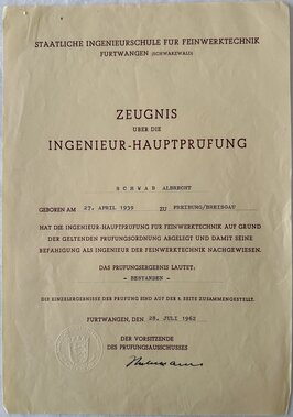 Geboren 1939 in Freiburg und dort aufgewachsen, absolvierte Albrecht Schwab 1959 eine Lehre als Werkzeugmacher. Getrieben vom Wunsch, sich weiterzuentwickeln, führte ihn sein Weg an die damalige Staatliche Ingenieurschule für Feinwerktechnik in Furtwangen, die heutige Hochschule Furtwangen (HFU). Dort legte er am 28. Juli 1962 seine Abschlussprüfung ab und zwar noch mit Rechenschieber statt Taschenrechner, diese kamen erst in Gebrauch und waren nicht erlaubt.