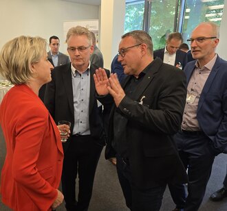 Angeregt über Forschung diskutierte Prof. Dr. Volker Bucher mit Dr. Nicole Hoffmeister‑Kraut, Wirtschaftsministerin von Baden‑Württemberg.