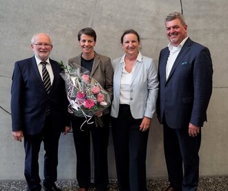 Wechsel in der Hochschulleitung an der HFU: Prof. Dr. Rolf Schofer wird sein Amt im März 2024 an seine neu gewählte Nachfolgerin Dr. Alexandra Bormann übergeben. Rektor Rolf Schofer (links), Hochschulkanzlerin Andrea Linke (2.v.rechts) und der Vorsitzende des Hochschulrats, Dirk Schallock (rechts), gratulierten herzlich zur neuen Aufgabe.