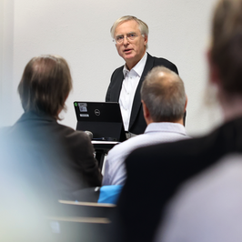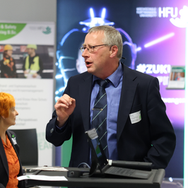 Prof. Dr. Stephan Lambotte, Dekan der Fakultät GSG, berichtete im Anschluss in einem humorvollen Beitrag, welche Welten zum Teil aufeinandertrafen, als die „klassischen Ingenieure“ begannen, mit den Expertinnen und Experten aus den neuen Fachbereichen zusammenzuarbeiten. Auch die Anzahl der Professorinnen und Professoren habe sich seit den Anfängen verdoppelt, berichtete Lambotte, der seine Fakultät weniger in Zahlen und Fakten vorstellte, sondern lieber von der Kompetenz – und den kleinen Eigenheiten – der Menschen berichtete, die sich dort engagieren.