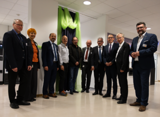 Feierliche Eröffnung des neuen Gebäudeflügels: (von links) Dekan Prof. Dr. Stephan Lambotte und Prof. Angela Dieterich von der Fakultät GSG, Bürgermeister Joseph Herdner, Michael Schätzle von DreiGe und Architekt Georg Fritz, Prof. Dr. Peter König, MdL Guido Wolf, Landrat Sven Hinterseh, Prorektor Prof. Dr. Ullrich Mescheder und MdL Niko Reith.
