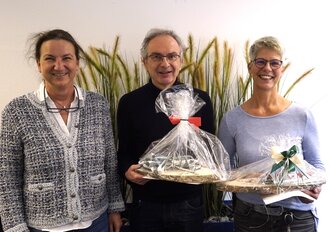 Für 25 Jahre im Öffentlichen Dienst durfte HFU-Kanzlerin Andrea Linke Karola Frank und Dr. Johannes Graf auszeichnen. Die Kanzlerin übergab eine Urkunde des Landes Baden-Württemberg und bedankte sich herzlich für das langjährige Engagement. Karola Frank ist seit 1999 Mitarbeiterin in der Studentischen Abteilung - und auch nach 25 Jahren mache ihr die Arbeit mit den Studierenden viel Spaß, berichtete sie. Dr. Johannes Graf ist als wissenschaftlicher Mitarbeiter des Deutschen Uhrenmuseums beschäftigt, wo genau vor 25 Jahren die erste Datenbank zur Digitalisierung der Ausstellungsstücke etabliert wurde. Beide freuten sich auch sehr über das Präsent, das Andrea Linke als Dankeschön der Hochschule ebenfalls überreichte.