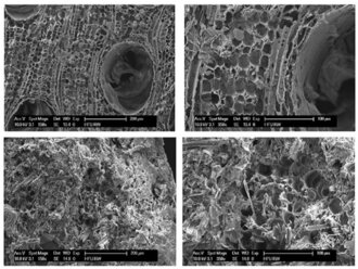 Die Bilder des Elektronenmikroskops zeigen deutlich, wie sich die Holzstruktur durch Plasmabeschichtung verändert (oben behandelt, unten unbehandelt).