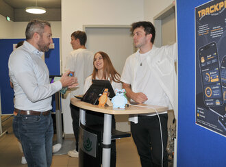 Von links: Christian Braun von der Karl Storz SE & Co. KG informiert sich bei den Studierenden Julia Weh und Robin Mayer über deren Projektarbeit „Trackpet“.