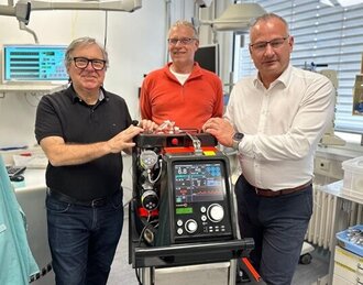 Übergeben wurde das neue System durch Prof. Dr. Ing. Christoph Benk (CEO und CTO Resuscitec). „CARL ist weltweit das erste Gerät speziell für die Anwendung der Extrakorporalen Zirkulation bei der Reanimation und kann auch außerhalb der Klinik im Notfalleinsatz verwendet werden “, erklärt Prof. Haimerl begeistert. Das Gerät wird an Vene und Arterie von Patientinnen oder Patienten angeschlossen, pumpt Blut durch den Körper, ermittelt dabei zahlreiche Messwerte und optimiert beispielsweise Blutfluss, Blutdruck oder Sauerstoffsättigung. Gleichzeitig kühlt das System das Blut, um den Stoffwechsel des Körpers zu reduzieren – ein entscheidender Faktor im Fall von Wiederbelebungsmaßnahmen. „Die Anwendung des Geräts erhöht die Überlebenswahrscheinlichkeit und das ‚Outcome‘ der Patienten bei einer Reanimation deutlich“, so Haimerl.
