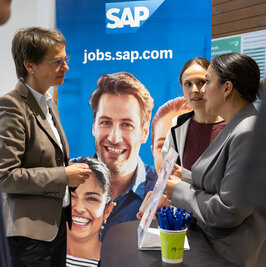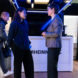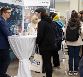 Bormann selbst nutzt die Kontaktbörse, um Unternehmenskooperationen zu festigen, in der Region und deutschlandweit. „Wir haben auch mit unserer Forschungsstärke, unseren herausragenden Laborausstattungen, und nicht zuletzt im Bereich Weiterbildung sehr viel für Unternehmen zu bieten“, sagt sie. Am Stand vom Bundesnachrichtendienst trifft die Rektorin auf Studierende und Professoren aus dem Fachbereich Informatik, die sich hier zum Thema Cybersicherheit mit den Experten austauschen – die Hochschule hat einen neuen Studiengang, dessen Absolvierende gefragte Fachkräfte sind. „Ich freue mich über den riesigen Andrang, und dass ich von unseren Studis und den Ausstellenden ein sehr positives Feedback bekommen habe: Die haben sich gesucht und gefunden!“