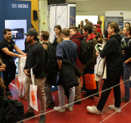 Bei der „Hochschulkontaktbörse“, der Firmenmesse an der Hochschule Furtwangen (HFU), haben sich erneut hochrangige Unternehmen am Campus Furtwangen präsentiert. Von IT bis Arbeitsschutz, von Medizin- zu Produktionstechnik – auf der „HKB“ treffen zweimal im Jahr begeisterte Studierenden auf rund 70 ausstellende Firmen, die aus ganz Deutschland anreisen. Auf der Suche nach Praktikumsplätzen, Thesisthemen oder gleich einer Berufsperspektive im Anschluss ans Studium nutzen die Studierenden die Gelegenheit für regen Austausch und um Kontakte zu knüpfen. Foodtrucks sorgen für leckere Stärkungen zwischendurch.