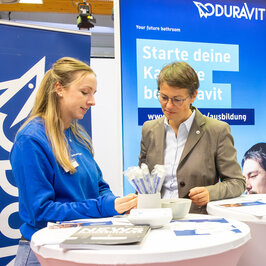 HFU Rektorin Dr. Alexandra Bormann im Austausch mit Unternehmen, die an der sehr gut besuchten Hochschulkontaktbörse in Furtwangen teilnahmen.