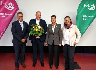 Delighted after a successful election: (from left) Chairman of the university Board of Governors, Dirk Schallock, the newly elected future Head of Administration, Andreas Friedrich, HFU President Dr Alexandra Bormann and the current Head of Administration, Andrea Linke.