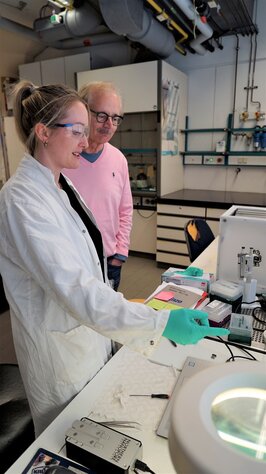 Eine Frau im Labormantel zeigt einem Mann etwas in einem Labor