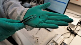 Ein kleiner Chip liegt auf einer behandschuhten Hand