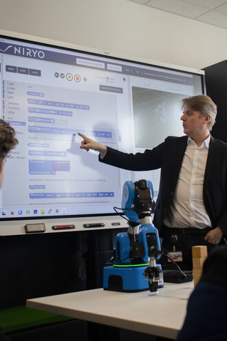 Bei den Niryo Ned2s handelt es sich um kleine, fest installierte Roboterarme, wie sie im großen Maßstab in der Industrie verwendet werden. Die Herausforderung bestand nun darin mit dem Vision-Set Teile zu identifizieren, zu sortieren und geordnet abzulegen. Dass der „Turmbau zu Babel“ eine nicht zu unterschätzende Aufgabe ist, stellten die Schüler beim Klötzchen stapeln schnell fest.