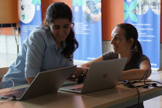 Zwei Frauen vor Laptops