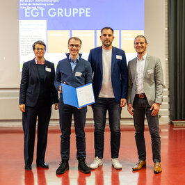 Die ersten Geehrten waren die Studierenden Sven Liehner, Marcel Reichle und Fabian Gehring – ihnen wurde für ihre Bachelor-Thesisarbeiten der Preis der Gisela und Erwin Sick Stiftung von Professor Jürgen Werner übergeben. Außerdem wurde Sabine Schleise für ihre Masterthesis im Studiengang Medieninformatik ausgezeichnet und gab in einem kurzen Vortrag einen Einblick in ihr Thema „Virtual Reality im industriellen Kontext“. Dabei ging es darum, die Realität in ihrer Dreidimensionalität darzustellen und so aus klassischen Bildern mit Hilfe von neuronalen Netzen 3D-Bilder zu erstellen und diese Anwendung für die Industrie nutzbar zu machen. Derzeit sind dazu auch zwei Patente in Arbeit. Dr. Matthias Henke von der Firma Aesculap übergab Preise für herausragende Abschlussarbeiten an Stefan Prinz und Lucas Moosmann. Stefan Prinz stellte dem Publikum das Thema „Gitterstrukturen“ vor, welches er für seine Thesis untersucht hat. Dabei werden mit Hilfe von Computermodellen und Simulationen Schwachstellen in Gitterstrukturen bestimmt, um Implantate zu optimieren. Alexander Stockburg von der Firma EGT überreichte Tobias Hauser den Schoen’schen Innovationspreis für seine Abschlussarbeit zum Thema „Purge Strategien für PEM Brennstoffzellen“, bei der es um den Vergleich von zwei Verfahren zur Entfernung von überflüssigen Gasen aus Brennstoffzellen ging, um diese effizienter zu machen, wie Hauser ausführte.