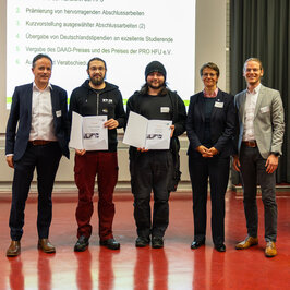 Neben den Stipendien wurden auch Preise für soziales Engagement vom Vorsitzenden des Fördervereins ProHFU Dr. Thomas Koepfer vergeben. Justin Dretvic und Daniel Koschützki erhielten die Auszeichnung. „Gerade das soziale Engagement ist besonders kostbar in diesen von Herausforderungen geprägten Zeiten – und als Hochschule haben wir auch eine gesellschaftliche Aufgabe. Es freut mich deshalb sehr, dass unsere Studierenden so aktiv sind.“, sagte Prorektor Enkler. Rektorin Bormann ergänzte: „Danke an alle Förderer und Studierenden. Wir sind für Sie da! Es ist wichtig im Austausch zu bleiben, um die beste Zeit gemeinsam zu prägen. Die Hochschule dient als Impulsgeber und gemeinsam mit den Unternehmen wollen wir die Gesellschaft für die Zukunft und Gegenwart stärken.“