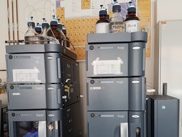Hier können organische Verbindungen zu hoher Reinheit aufgereinigt werden, dies ist i.d.R. notwendig, wenn solche Verbindungen mikrobiell untersucht werden sollen. - Zwei Waters Acquity UPLC Anlagen mit DAD und UV Detektoren,